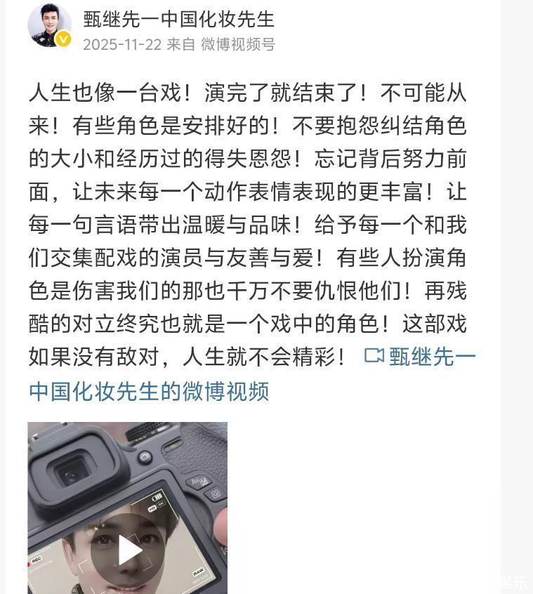 今年11月份时,他还发了一条动态,这条动态看起来有些语意不明,像是暗示自己在生活中遇到了一些险恶之人,但仍然鼓励自己要坚强,坚持把人生这场戏演完。