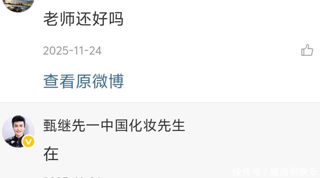 当时看到他这一则说法,就有网友察觉到他的心态有些低落,关心问候他。他只回了一个字“在”,虽然很简明,看得出还是很宠粉的。