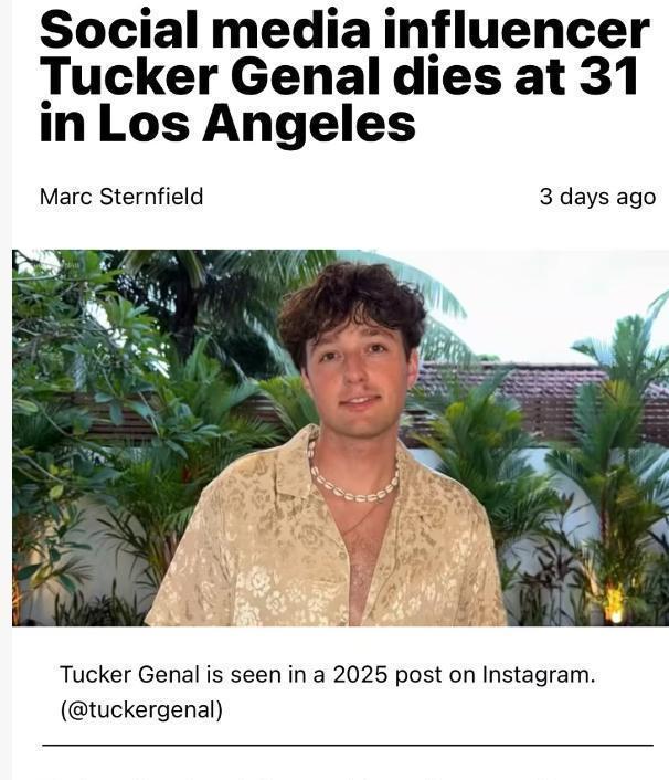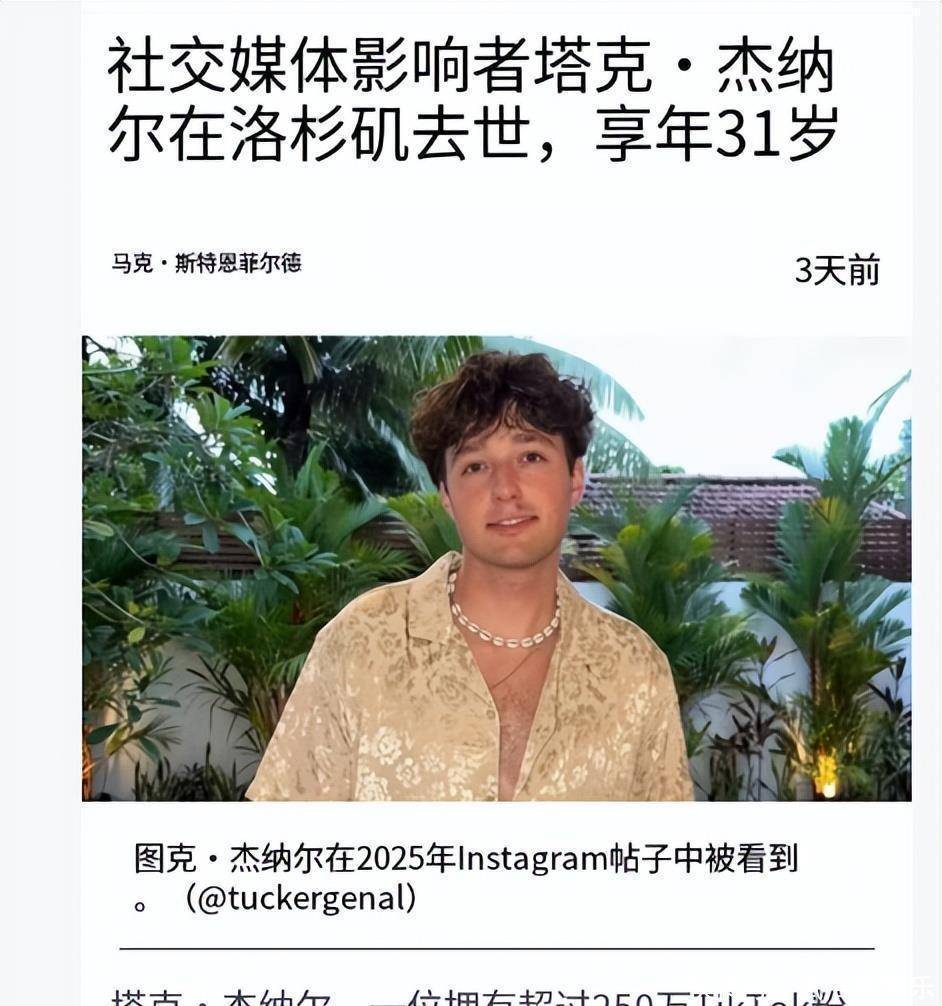 在过去2025年的年末,已经有3位明星名人离开了我们,都让人感到格外的惋惜。一、杰纳尔2025年12月11日,百万粉丝网红塔克·杰纳尔自杀身亡,年仅31岁。